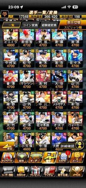 ・投打大谷、祝宴宮西、熱気坂倉、火の玉藤川、ジャリエル、守備A坂本、最強大山など所持